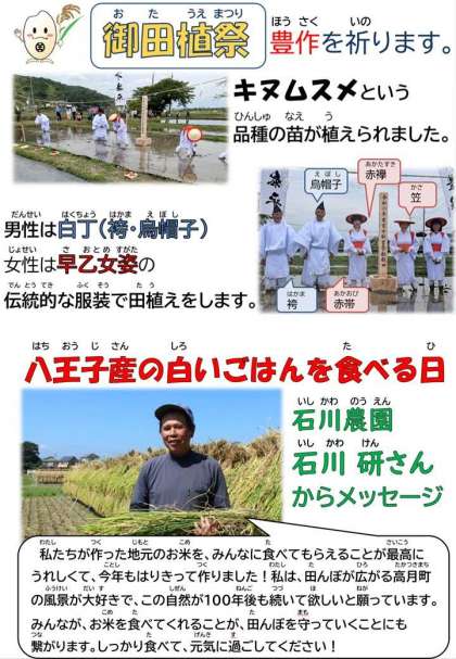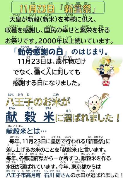 今日は、八王子産の白いごはんをいただきました。よくかむほどごはんの甘みを感じます。子どもたちから「おいしい」という声が聞かれ、好評でした。