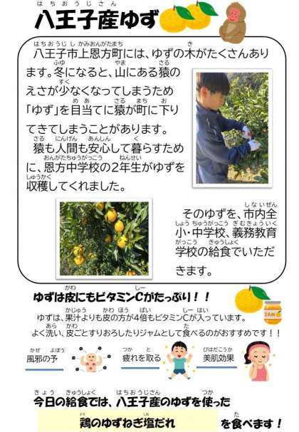 今日は、八王子市上恩方町でとれたゆずを使って「鶏のゆずねぎ塩だれ」を作りました。ゆずの香りが爽やかな、ごはんが進む料理です。