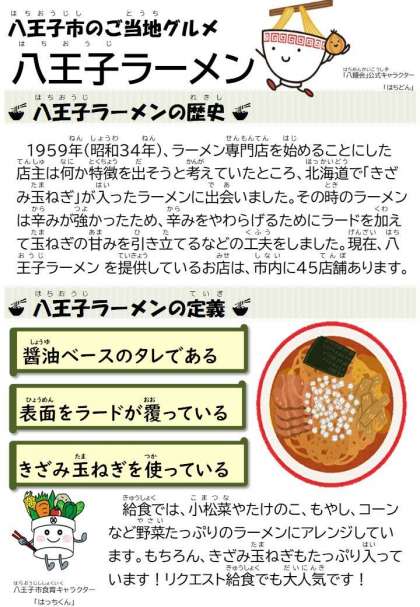 今日は、八王子のご当地グルメ「八王子ラーメン」を給食用に少しアレンジしていただきました。八王子ラーメンの特徴などについては、食育メモをご覧ください。