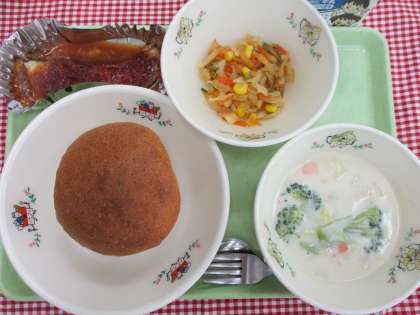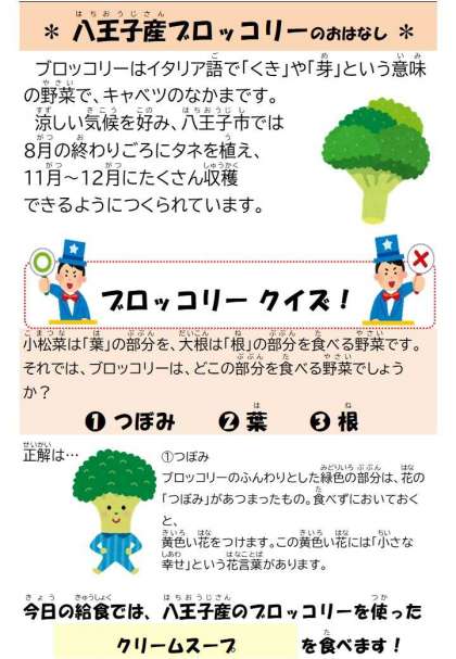 八王子産のブロッコリーを使って、さらりとしたコクのあるクリームスープを作りました。子どもたちはよく食べていました。