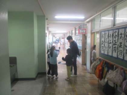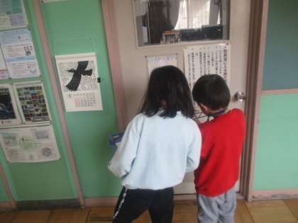 1月27日(月)1年生が廊下を歩きながら、数を探していました。カレンダーやクラス表示など、意外なところに数はあるもので、子どもたちは数字のある場所を見つけては、友だちと一緒にノートに書き込んでいました。生活と結び付けながら学ぶことで、教室で学んだ内容への理解を確かなものにしていきます。
