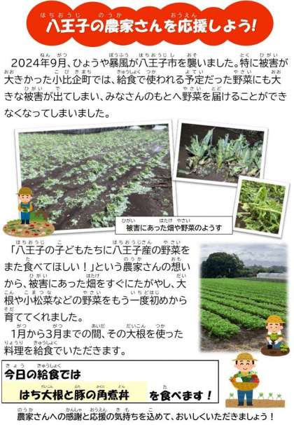 1月31日の給食 公開日 2025/01/31 更新日 2025/01/31 今日の献立 *献立* はち大根と豚の角煮丼 野菜のごまじゃこあえ じゃがいものみそ汁 牛乳 豚肉と八王子産のだいこんを酒・しょうゆ・さとう・みりん・水で煮てつくりました。 ☆きょうの八王子産☆ だいこん いいね(0)