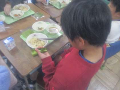 2月3日(月)今年の節分は、2月2日でした。1日遅れにはなりますが、この日の給食は、節分にちなんだ給食でした。つみれ汁には、鬼の顔のかまぼこが入り、手巻き寿司を恵方巻に見立てて食べました。「願い事を思い浮かべて、黙って食べるんだよ。」と、みんな楽しそうでした。