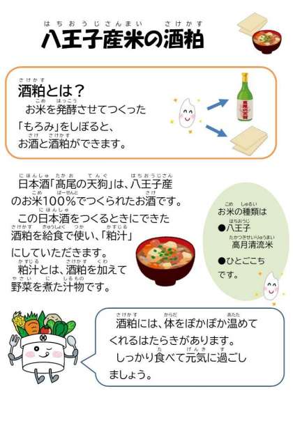 2月7日の給食 公開日 2025/02/07 更新日 2025/02/07 今日の献立 *献立* ごはん ホキのごまがらめ じゃこキャベツ 八王子産米の粕汁 牛乳 今日は、八王子産米からできた「酒粕」を使った粕汁をいただきました。酒粕の香りを感じながらも体があたたまるおいしい粕汁に仕上がりました。 ☆きょうの八王子産☆ 酒粕 だいこん ながねぎ こまつな いいね(0)