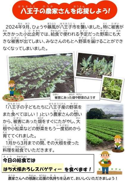 2月10日の給食 公開日 2025/02/12 更新日 2025/02/12 今日の献立 *献立* はち大根おろしスパゲティー カリカリじゃこサラダ 豆腐とチンゲンツァイのスープ 牛乳 ☆きょうの八王子産☆ だいこん キャベツ いいね(0)