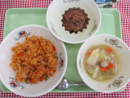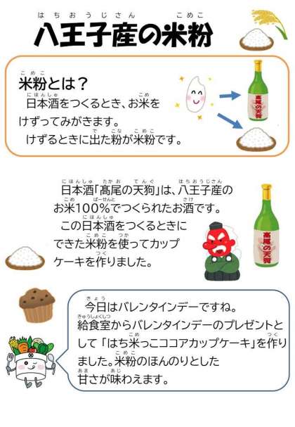今日は、バレンタインデーです。給食では、八王子産の米からつくられた米粉を使ったチョコチップ入りのココアカップケーキをつくりました。米粉のもちもち感を味わえるカップケーキです。