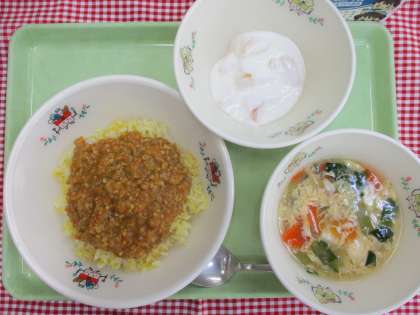 ビーンズドライカレーは、刻んだ大豆を豚肉・たまねぎ・にんじんと一緒に炒めてつくりました。豆が苦手な子も笑顔で食べており、子どもたちからは「これおいしい!」と好評でした。