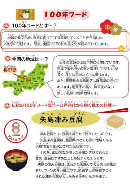 今月の100年フードは、長野県の「矢島凍み豆腐」です。給食の時間、みそ汁に入っている凍み豆腐をみつけた子が「これ、何?」と声をかけてくれました。それを機に「矢島の凍み豆腐」についてその学級で紹介すると、子どもたちから「凍らせるの?」「えっ、もとは豆腐?」と次々と楽し気な声があがりました。