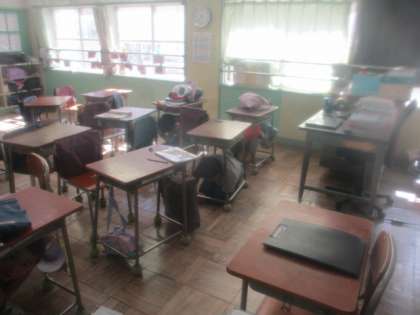 2月26日(水)避難訓練がありました。この日は、予告なしの訓練でした。地震はいつ起こるかわかりません。実際にある電話線の繋がっていない電話ボックスの話をしながら、「大切な命を守れるよう、日頃からしっかり準備しましょう。」と話しました。