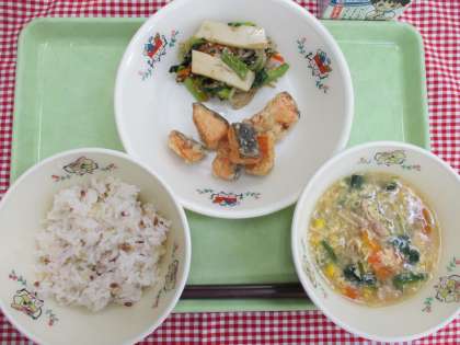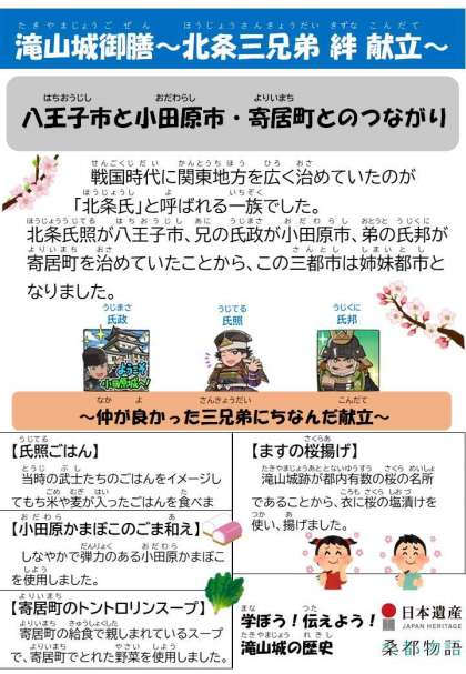 今日は、滝山城御膳をいただきました。ますの桜揚げは、桜の塩漬けのほんのりとした塩加減がアクセントとなり、春の訪れを感じさせる料理に仕上がりました。子どもたちからはおいしいという声が聞かれました。