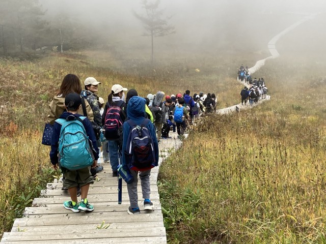 5年生は、入笠湿原ハイキングで霧と紅葉がかもす幻想的な雰囲気を楽しみました。予定どおり八ヶ岳自然の家に到着し、開校式、避難訓練を終え、今、夕食をいただいています。前に出て話をする子も食事係など係の子もみんな自分の役割をしっかりと務めているのが印象的です。