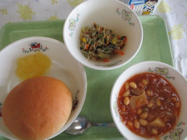 手作りジャムサンド、ポークビーンズ、カリカリじゃこサラダ、牛乳