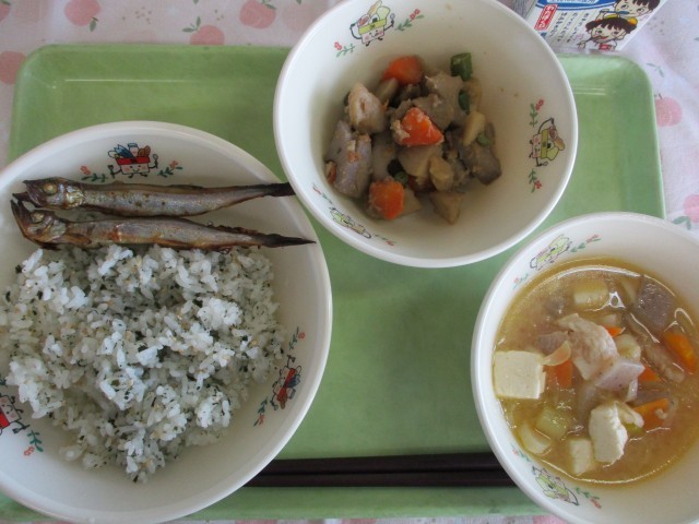 わかめご飯、ししゃものカレー焼き、呉汁、里芋の旨煮、牛乳