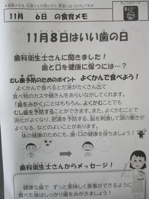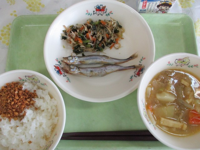 ご飯、アーモンドふりかけ、焼きししゃも、豚汁、青菜の変わり浸し、牛乳