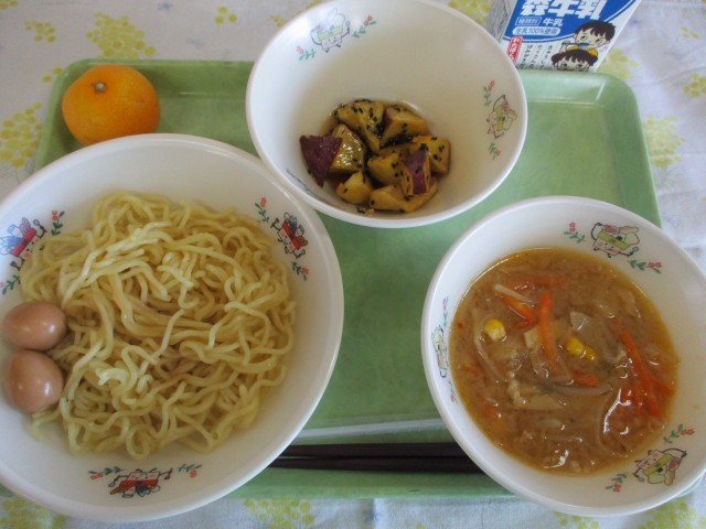 味噌ラーメン、うずらの煮卵、大学芋、果物(みかん)、牛乳