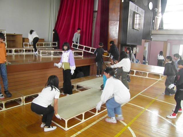 11月11日(火)1校時に5年生が学習発表会の片付けに取り組みました。これまで学校行事の準備・片付けを担ってきた6年生から5年生にバトンタッチです。力を合わせて椅子やマット、ステージの台などを片付け、予定よりもずいぶん早く片付けが完了しました。また、学習発表会を終えて各学年でカードによる伝え合いが行われています。学習発表会でのがんばりをこれからの学校生活につなげていってほしいと期待します。