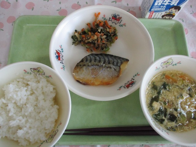 ご飯、さばの塩焼き、かきたま汁、よごし、牛乳