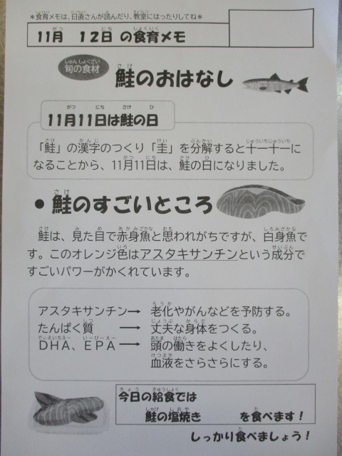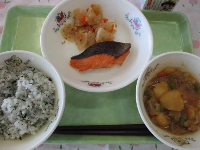 わかめご飯、鮭の塩焼き、肉じゃが、ごま大根、牛乳