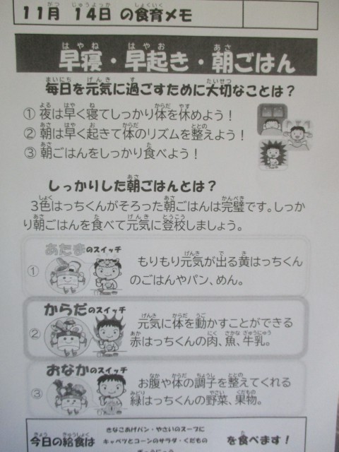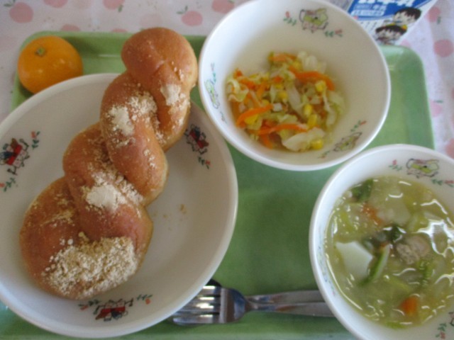 きなこ揚げパン、野菜のスープ煮、キャベツとコーンのサラダ、果物(みかん)、牛乳