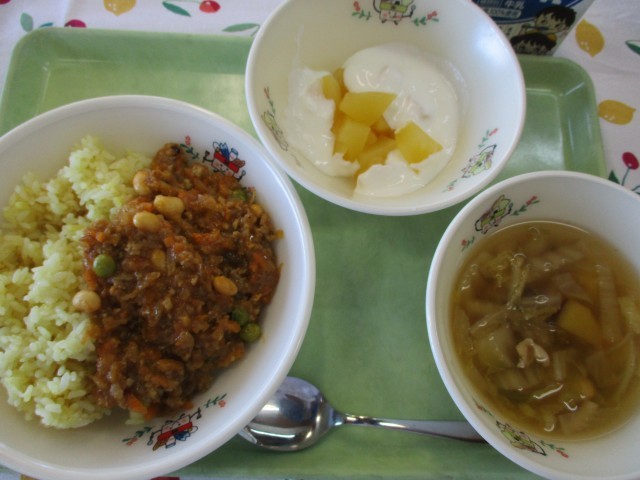 ビーンズドライカレー、白菜とさつま芋のスープ、フルーツヨーグルト、牛乳