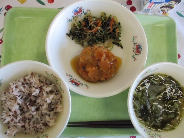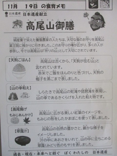 天狗ご飯、高尾揚げもみじあんかけ、山の幸和え、翠靄汁、牛乳