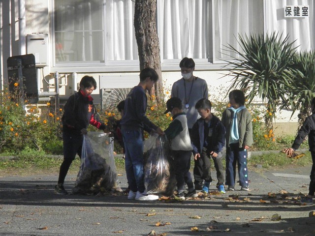 11月21日(金)朝の時間に栽培環境委員会の担当の子どもたちのリードにより2年生が落ち葉拾いに取り組みました。2年1組は学級閉鎖からの登校再開日でしたが、2組の子たちとともに元気に落ち葉を集めてくれました。早朝から率先して落ち葉集めに取り組んでくれている高学年の子たちもいます。豊かな自然の分、たくさんの落ち葉が集まります。
