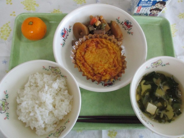 ご飯、厚焼き玉子、秋のお吸い物、大豆入り筑前煮、果物(みかん)、牛乳