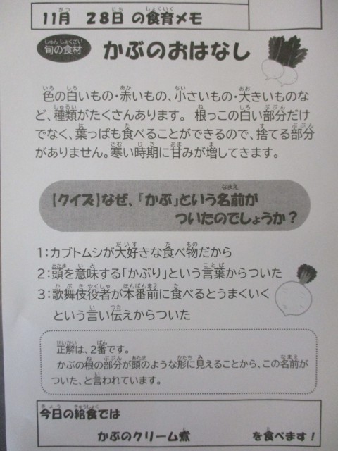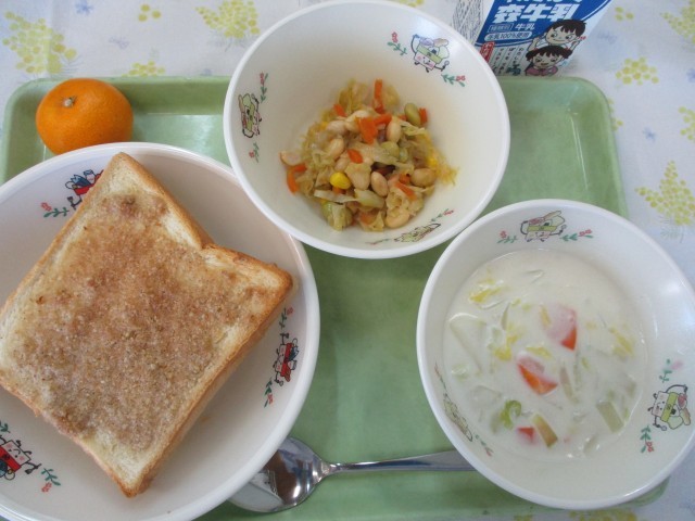 セサミトースト、かぶのクリーム煮、豆サラダ、果物(みかん)、牛乳