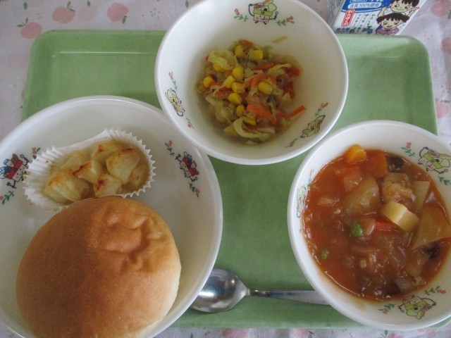 国産小麦パン、金時豆のチキンシチュー、キャベツとコーンのサラダ、焼きリンゴ、牛乳