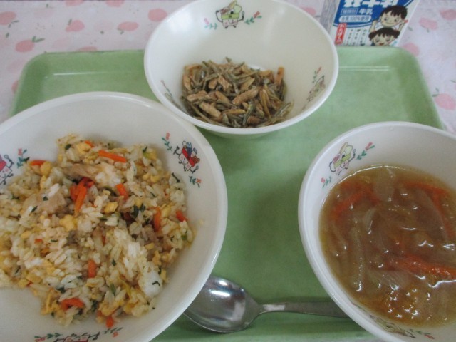キムチたまごチャーハン、たまねぎのスープ、ごまめナッツ、牛乳