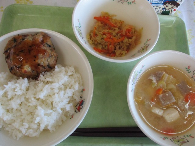 ご飯、れんこんとひじきのハンバーグ、呉汁、南蛮キャベツ、牛乳