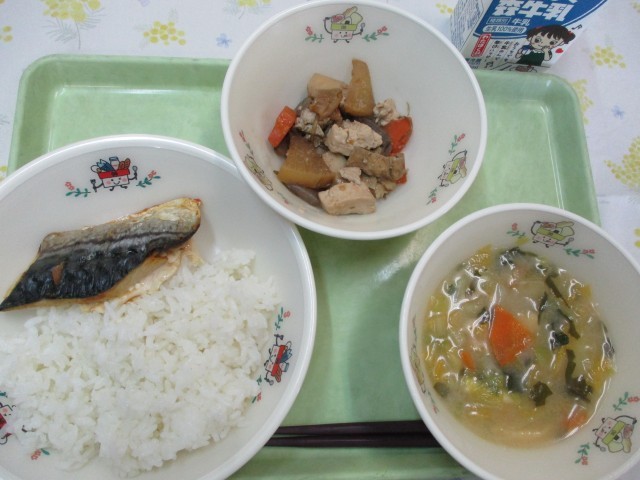 ご飯、さばの塩焼き、大歳のごっつお、具だくさん味噌汁、牛乳