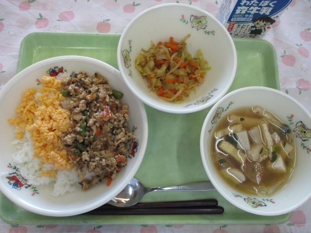 二色丼、芋の子汁、野菜のおかか和え、牛乳