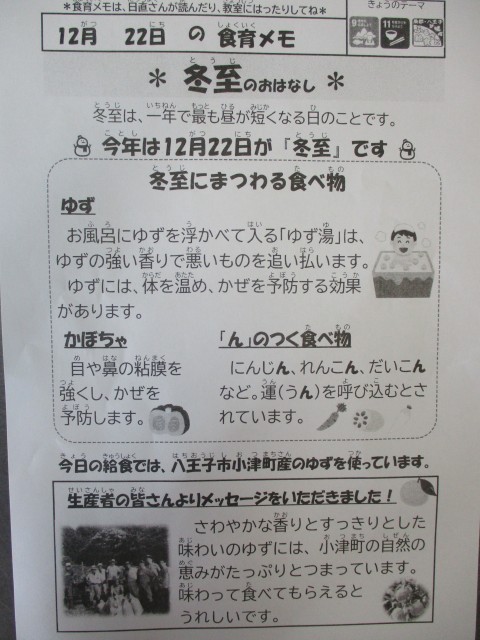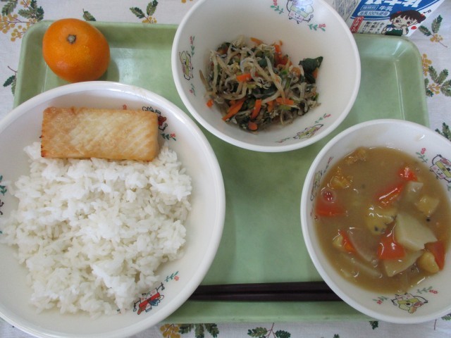 ご飯、いかの八王子産柚子味噌焼き、かぼちゃのすいとん、青菜とじゃこのおひたし、果物(みかん)、牛乳