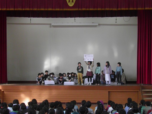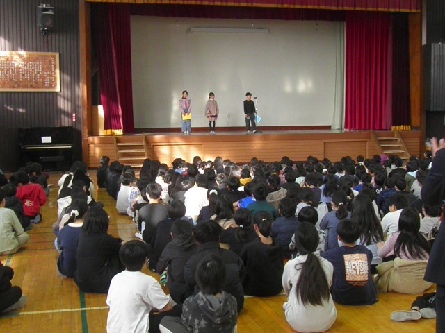 12月25日(木)朝の時間に体育館で2学期終業式を行いました。校長からは、「あゆみを大切にすること」「冬休みのチャレンジ」「安全安心な冬休みのために」について話をしました。3年生の代表児童の3名が2学期の振り返りを立派な態度で発表しました。校歌を歌って終業式をまとめた後に、生活指導主任から、「物の管理」「SNSの使い方」「冬休みの過ごし方」について具体的な話がありました。その後、3年生が総合的な学習の時間で学んでいる各町会の「どんど焼き」の日程や場所について紹介してくれました。2学期は熱中症や感染症の対策でオンラインで朝会を行うことが多かったのですが、終業式では、しっかりと話を聞くことができていて、成長を感じました。今日一日をしっかりまとめ、充実した冬休みを過ごしてほしいと思います。
