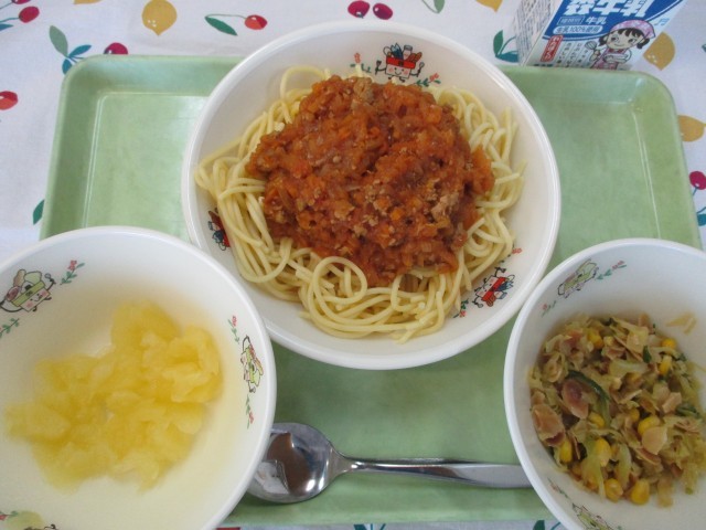 スパゲティミートソース、パリパリアーモンドサラダ、果物(りんご缶)、牛乳