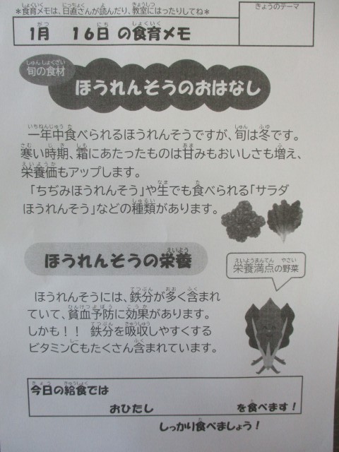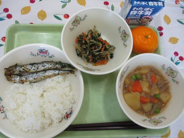 ご飯、ししゃもの磯辺焼き、じゃが芋のそぼろ煮、ほうれん草(八王子産)のおひたし、果物(みかん)、牛乳