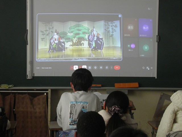 1月23日(金)5年生は、八王子市版「笑顔と学びの体験活動プロジェクト」で伝統芸能の「八王子 車人形」について学びました。このプロジェクトでは、第二中学校で行われている体験をオンラインで視聴しました。車人形の歴史や特徴などについての実演を交えた説明に5年生は興味深そうに視聴していました。