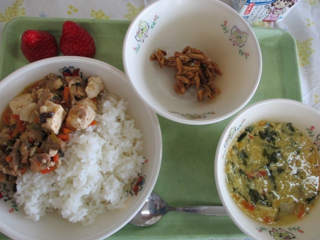 ご飯、四川豆腐、中華風コーンと卵のスープ、アーモンド黒糖、果物(いちご)、牛乳