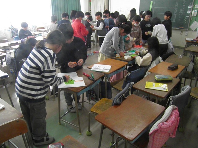 1月30日(金)4年生の教室では、子どもたちが来週6日(金)に予定されている九小ワールドの準備に楽しそうに取り組んでいました。九小ワールドは、3~6年生がお店を出し、全校の子どもたちが楽しく交流する行事です。子どもたちが楽しみにしている様子が伝わってきます。