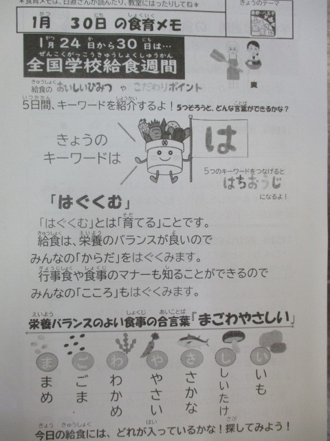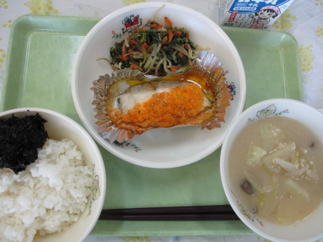 ご飯、夕焼小焼やき、呉汁、野菜の彩り和え、のりの佃煮、牛乳