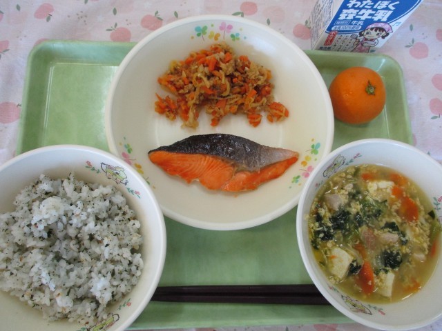 わかめご飯、鮭の塩焼き、かき玉味噌汁、人参しりしり、果物(みかん)、牛乳