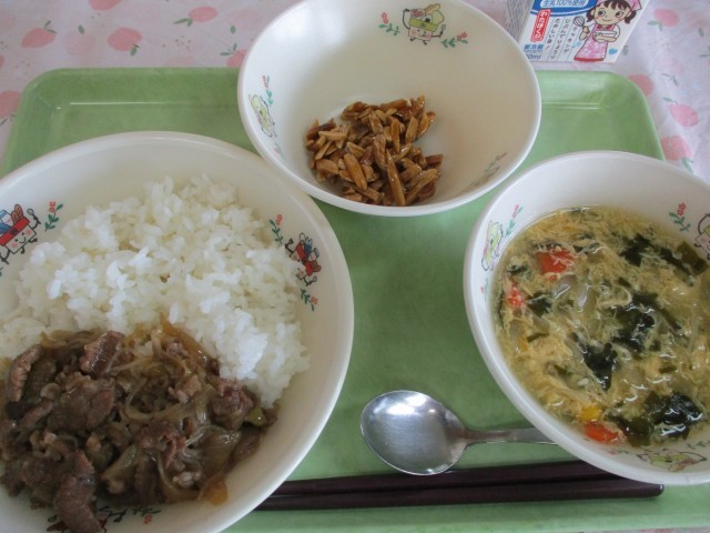 ご飯、牛肉の甘辛煮、わかめと卵のスープ、アーモンド黒糖、牛乳