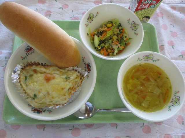 国産小麦パン、魚とポテトのグラタン、千切り野菜のスープ、ツナサラダ、りんごジュース