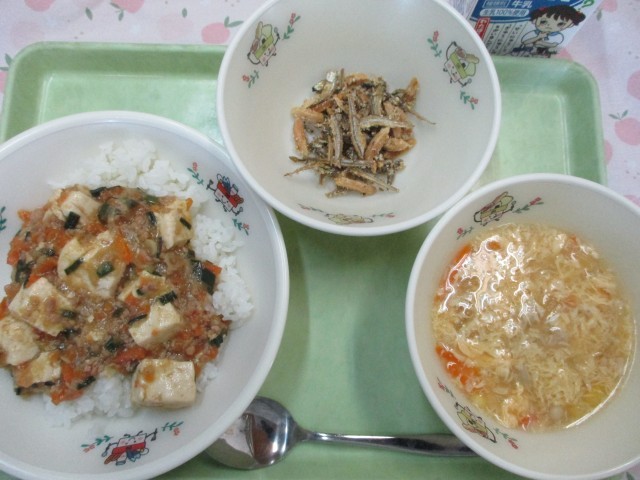 ご飯、マーボー豆腐、卵スープ、ごまめナッツ、牛乳