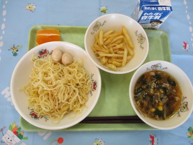 八王子ラーメン、うずら卵のからめ煮、フライドポテト、果物(デコポン)、牛乳