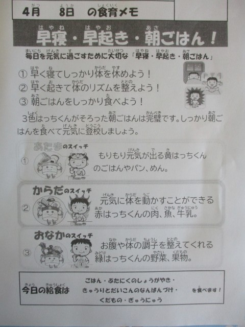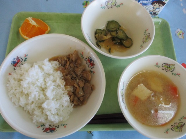 ご飯、豚肉の生姜焼き、田舎汁、きゅうりと大根の南蛮漬け、果物(清見オレンジ)、牛乳