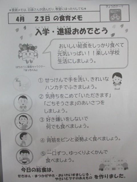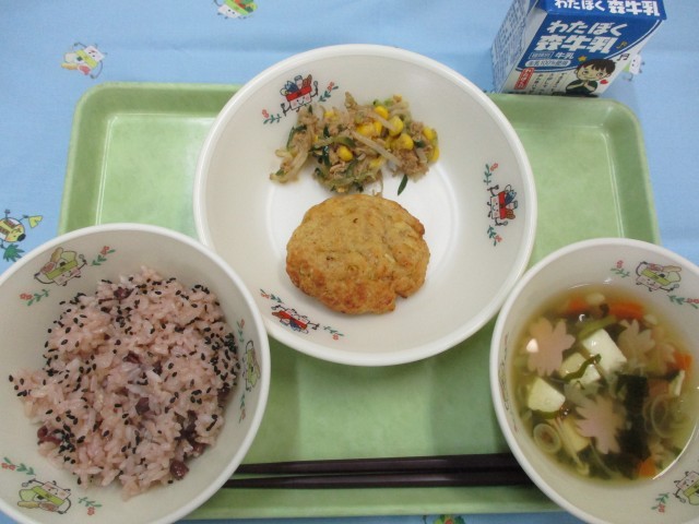 赤飯、松風焼き、お祝いすまし汁、野菜とツナの和えもの、牛乳