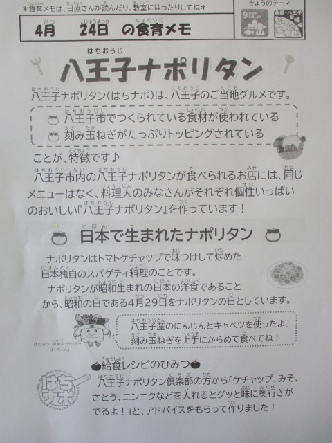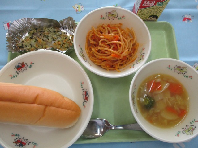 ミルクパン、魚の香草パン粉焼き、八王子ナポリタン、ポトフ、りんごジュース
