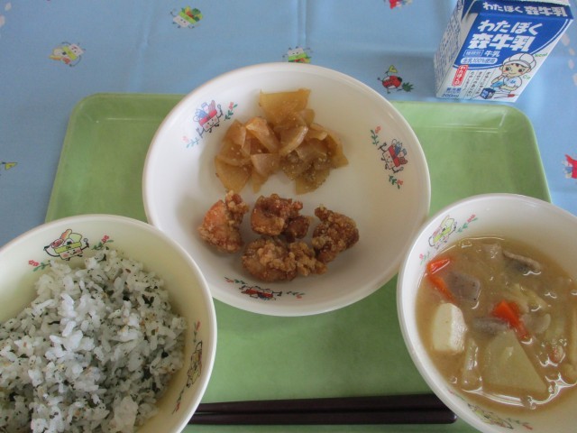 わかめご飯、鶏のコロコロ揚げ、豚汁、ごま大根、牛乳